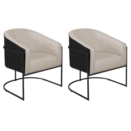 Kit 02 Poltronas Luiza Base de Ferro Preto Factor Preto e Linho Bege - Amarena Móveis