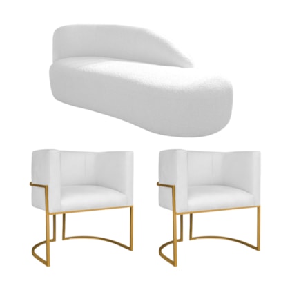 Kit Divã Luna 140cm Lado Direito e 02 Poltronas Base de Ferro Dourado Suede Branco