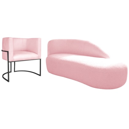 Kit Divã Luna 160cm Lado Direito e 01 Poltrona Base de Ferro Preto Suede Rosa Bebe