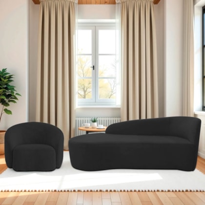 Kit Divã Recamier Orgânico França 140cm Lado Esquerdo e Poltrona Amore Bouclé Preto - Amarena Moveis