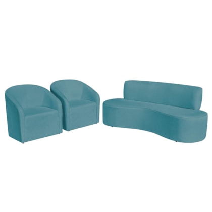 Kit Sofá Curvo Amsterdã 200cm e 2 Poltronas Luiza Max Suede Azul Turquesa - Amarena Moveis